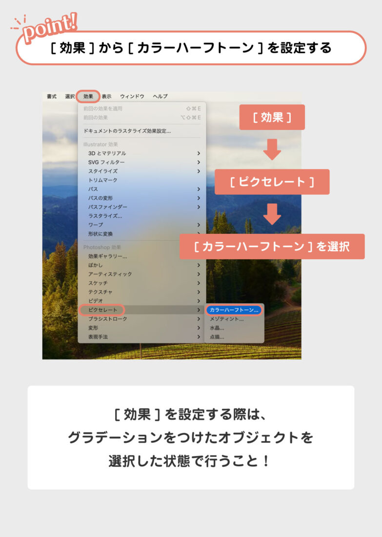 上部のメニューバーから[効果] → [ピクセレート] → [カラーハーフトーン]を選択。