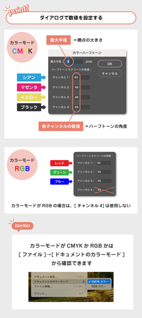 すると、カラーハーフトーンのダイアログが表示されるので、