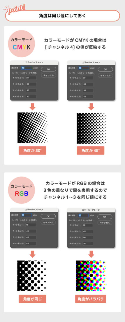 [ハーフトーンスクリーンの角度]は、どちらにしても全て同じ値にしておけばOKです。