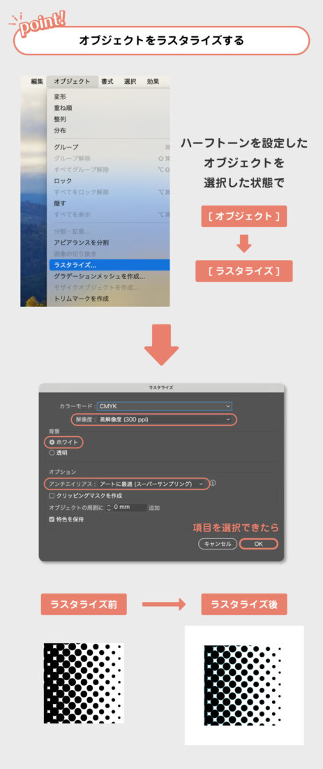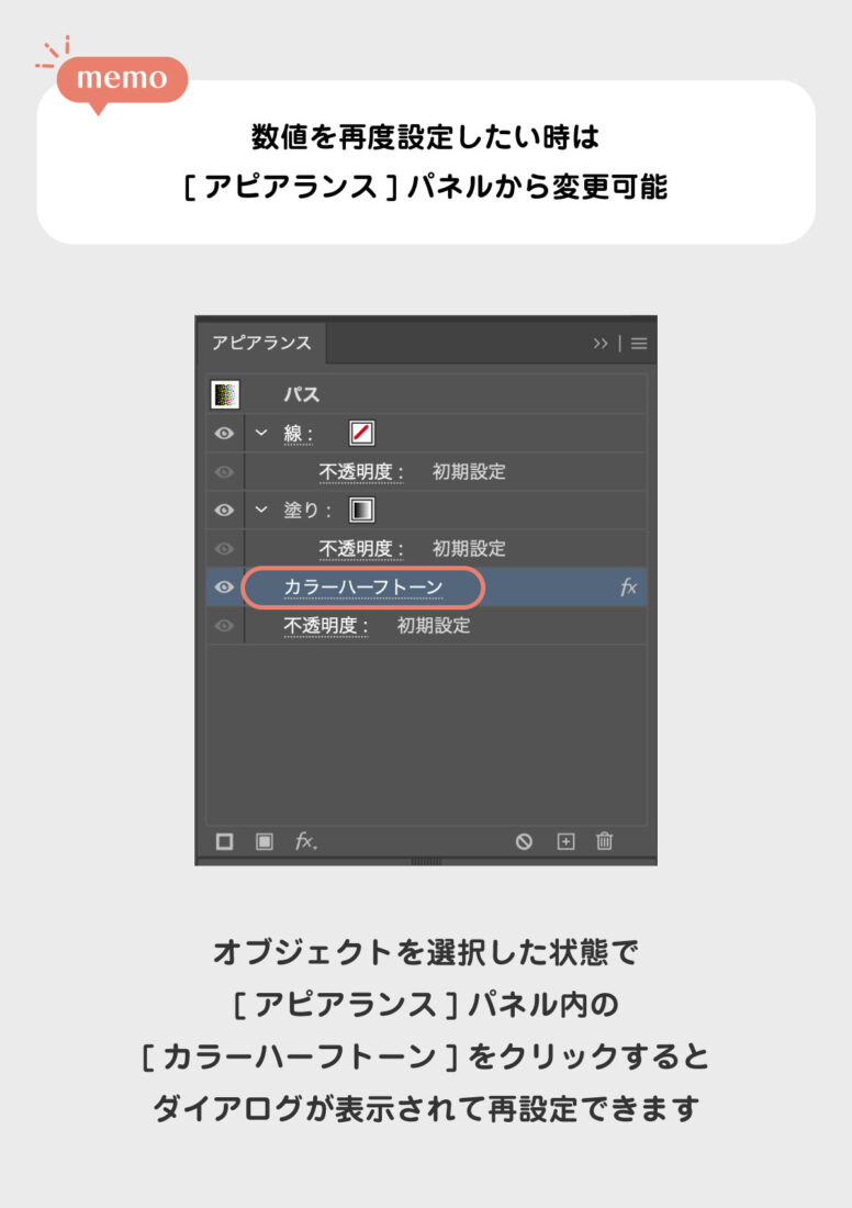 今回はオブジェクトに対してハーフトーンの効果を設定しましたが、