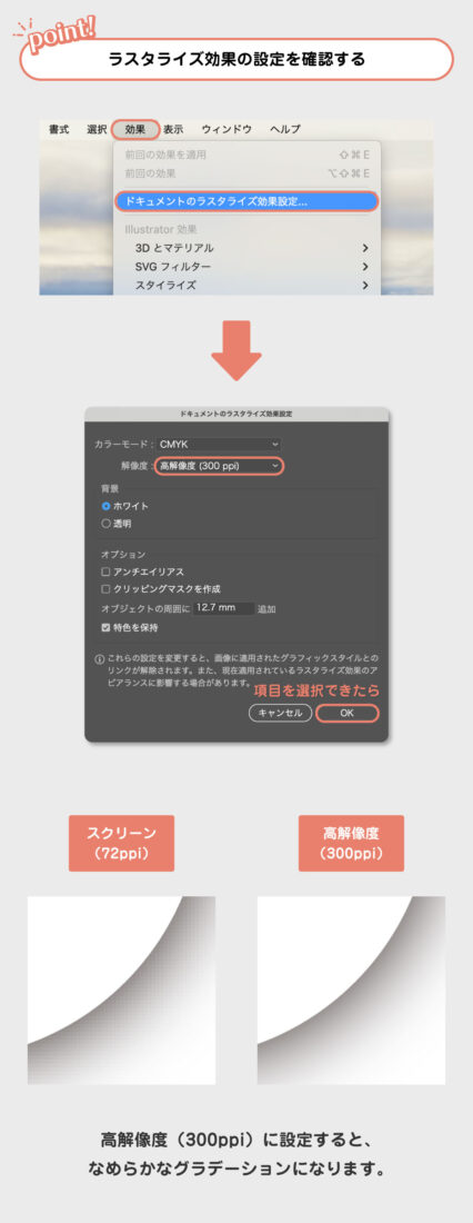 解像度の項目は、[高解像度(300ppi)]になるように設定しておきます。