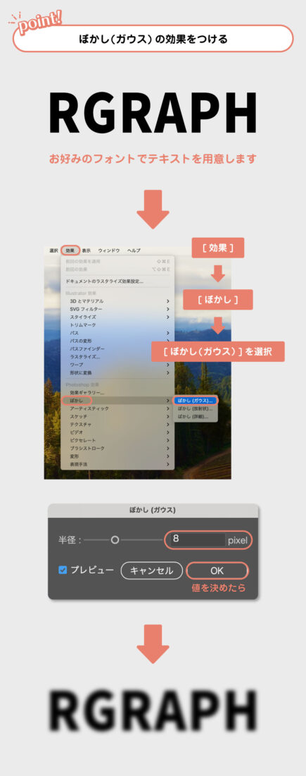 まずは、用意したテキストにガウス(ぼかし)効果をつけます。