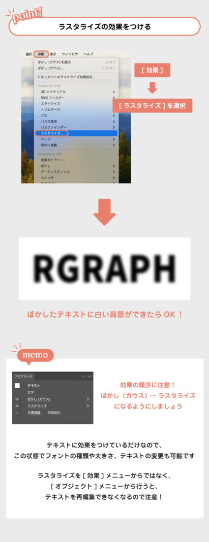 次は、ぼかしたテキストにラスタライズの効果をつけます。