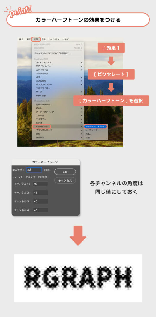 テキストを選択した状態で、上部メニューバーの[効果] → [ピクセレート] → [カラーハーフトーン]を選択。