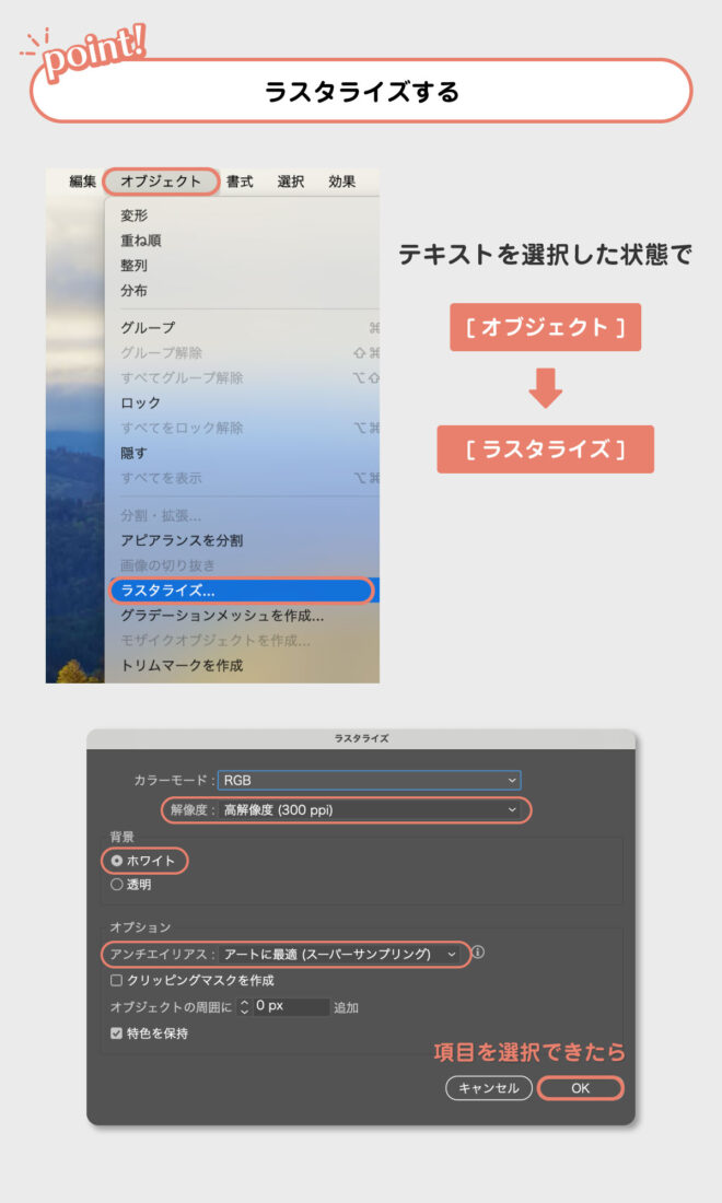 テキストを選択した状態で、上部メニューバーの[オブジェクト] → [ラスタライズ]を選択。
