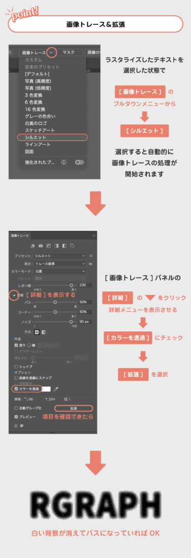 ラスタライズ(画像化)したテキストをパス化していきます。